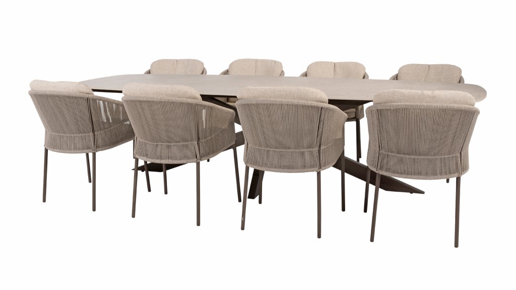 Ein wunderschöner, eleganter Tisch mit einer atemberaubenden ovalen Keramikplatte, erhältlich in 240 cm oder 300 cm. Die Platte strahlt nicht nur Eleganz aus, sondern besticht auch durch ihr markantes, modernes Aussehen. Das markante Kreuzbein ist in drei Farben erhältlich, sodass Sie diesen Tisch mühelos an Ihre Bedürfnisse und Vorlieben anpassen können. Ob Industrieschwarz, warmes Latte oder schickes Terre – jede Farbe verleiht dem Tisch einen einzigartigen Charakter und einen Hauch von Luxus. Mit seinen großzügigen Abmessungen bietet dieser Tisch ausreichend Platz für ein gemütliches Essen mit Freunden oder ein intimes Abendessen mit der Familie. Die Kombination aus raffinierter Keramik und dem starken, stilvollen Bein macht diesen Tisch nicht nur funktional, sondern setzt auch ein atemberaubendes Statement in Ihrem Garten.