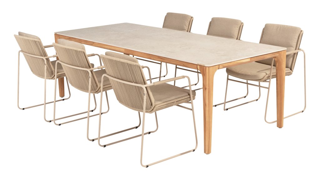 Der Liam 240 cm Keramik ist mit einer großzügigen Größe von 240 x 100 x 75 cm eine schöne Ergänzung für jeden Essbereich. Der Rahmen aus Teakholz bietet eine warme, natürliche Optik und sorgt für Stabilität und Langlebigkeit. Teakholz eignet sich perfekt für den Langzeitgebrauch und hält unterschiedlichen Wetterbedingungen stand, sodass der Tisch sowohl für den Innen- als auch für den Außenbereich geeignet ist. Die Keramikplatte verleiht einen modernen Touch und ist leicht zu pflegen. Es ist flecken- und kratzfest und eignet sich daher ideal für alltägliche Mahlzeiten und besondere Anlässe. Die rechteckige Form des Liam-Tisches zeichnet sich durch abgerundete Ecken und Abschlüsse aus, was für ein weiches, einladendes Erscheinungsbild sorgt. Dieses Design macht den Tisch nicht nur praktisch, sondern auch stilvoll und passt perfekt in verschiedene Einrichtungsstile, von modern bis rustikal. Der Liam ist in Vollteakholz erhältlich, oder im Teakholz-Keramik:
