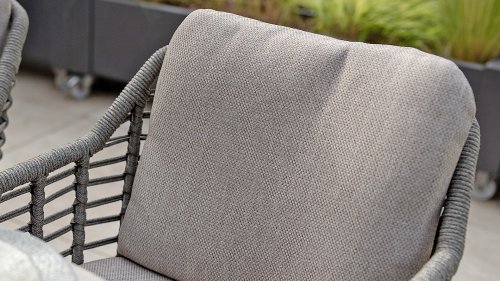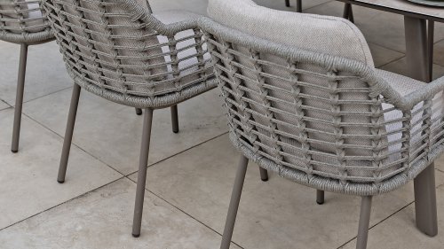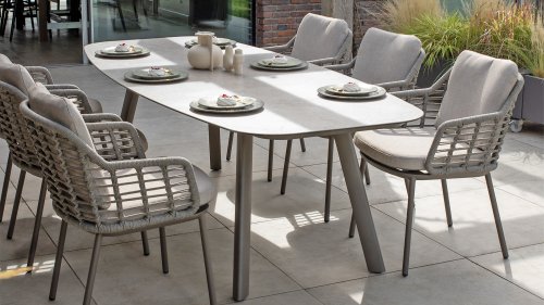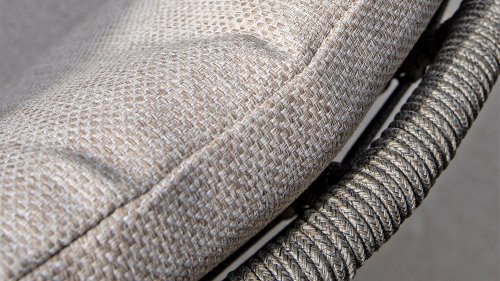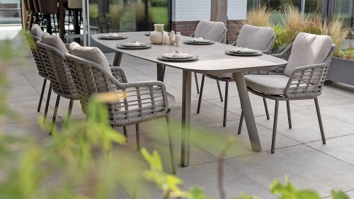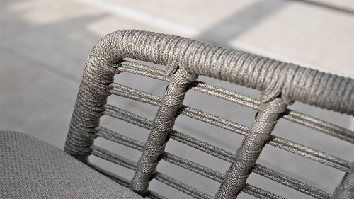 Holen Sie sich die warme, authentische Atmosphäre Süditaliens auf Ihre Terrasse. Diese Kollektion ist ein absolutes Muss für alle, die hochwertiges Design, organische Formen und höchsten Sitzkomfort suchen. Die Stärke der Puglia-Serie liegt in der gelungenen Materialkombination. Das Gestell besteht aus pulverbeschichtetem Aluminium – leicht und rostfrei. Rückenlehne und Armlehnen sind kunstvoll mit hochwertigem Seilgarn umflochten. Dadurch erhalten Stühle und Bänke eine offene, luftige Optik, die perfekt in den modernen Garten passt. Für zusätzlichen Komfort sind die Möbel mit Kissen aus Olefin-Gewebe ausgestattet. Dieses Material ist nicht nur wunderbar weich, sondern auch schmutzabweisend und wetterbeständig. So ist ein unerwarteter Sommerregen kein Problem.