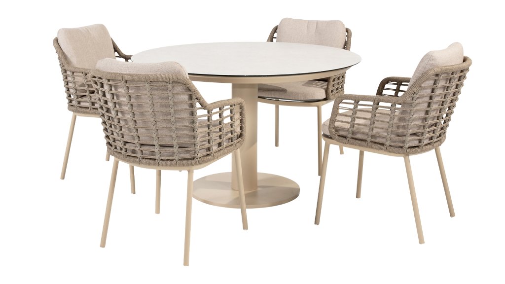 Lernen Sie Taste Sarah kennen, den runden Tisch, der Eleganz und Funktionalität mühelos vereint. Dieser schöne Tisch ist ein echter Hingucker in jedem Garten oder Essbereich. Sein rundes Design schafft eine gemütliche, einladende Atmosphäre, in der alle am Tisch in Kontakt bleiben. Die hochwertig bedruckte Keramikplatte sorgt nicht nur für eine luxuriöse Optik, sondern ist auch außergewöhnlich robust, kratzfest und pflegeleicht. Das zentrale Bein bietet maximale Beinfreiheit und verleiht dem Tisch einen modernen, luftigen Look. Taste by 4 Seasons Outdoor Sarah ist in zwei Ausführungen und zwei Farben erhältlich. Der Tisch ist in zwei Größen erhältlich: 120x75cm (Dining) und 130x69cm (Low Dining) in den Farben Latte und Terre. Entdecken Sie sie unten: