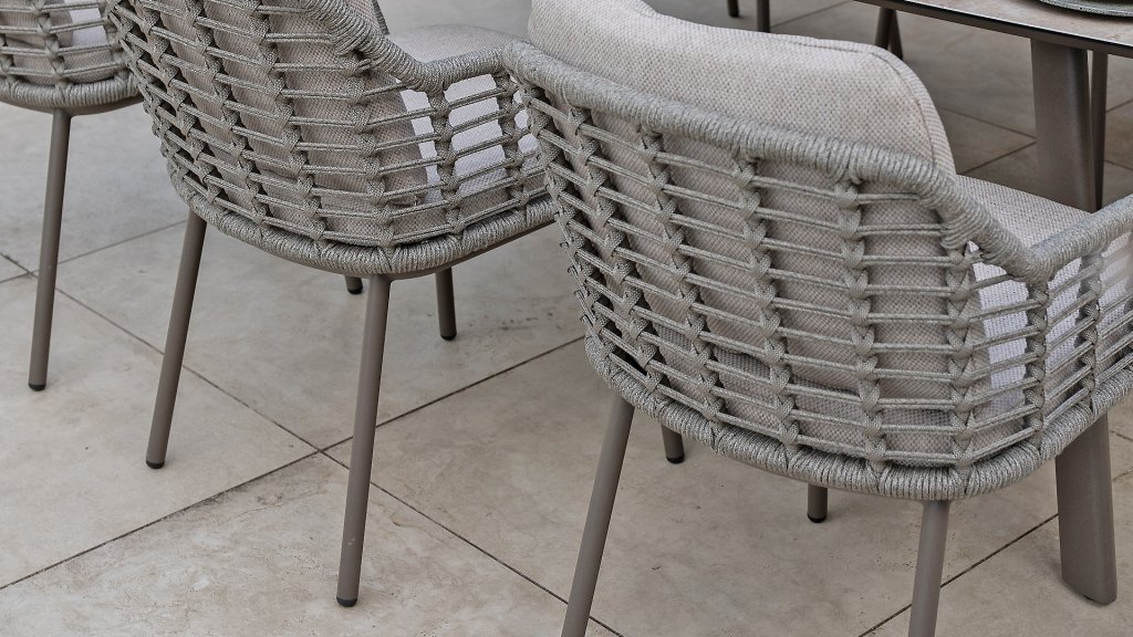 Die Stärke der Puglia-Serie liegt in der cleveren Materialkombination. Der Rahmen besteht aus pulverbeschichtetem Aluminium – leicht und rostfrei. Rücken- und Armlehnen sind kunstvoll aus hochwertigem Rope-Geflecht gefertigt. Dies verleiht den Stühlen und Sofas eine offene, luftige Optik, die perfekt in moderne Gärten passt. Für zusätzlichen Komfort sind die Möbel mit Kissen aus Olefin-Stoff ausgestattet. Dieses Material ist nicht nur angenehm weich, sondern auch schmutzabweisend und wetterbeständig. Ein unerwarteter Sommerregen ist daher kein Problem.