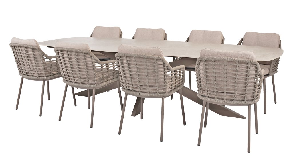 Ein wunderschöner, eleganter Tisch mit einer atemberaubenden ovalen Keramikplatte, erhältlich in 240 cm oder 300 cm. Die Platte strahlt nicht nur Eleganz aus, sondern besticht auch durch ihr markantes, modernes Aussehen. Das markante Kreuzbein ist in drei Farben erhältlich, sodass Sie diesen Tisch mühelos an Ihre Bedürfnisse und Vorlieben anpassen können. Ob Industrieschwarz, warmes Latte oder schickes Terre – jede Farbe verleiht dem Tisch einen einzigartigen Charakter und einen Hauch von Luxus. Mit seinen großzügigen Abmessungen bietet dieser Tisch ausreichend Platz für ein gemütliches Essen mit Freunden oder ein intimes Abendessen mit der Familie. Die Kombination aus raffinierter Keramik und dem starken, stilvollen Bein macht diesen Tisch nicht nur funktional, sondern setzt auch ein atemberaubendes Statement in Ihrem Garten.t